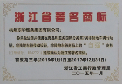 日前,由浙江省工商行政管理局認(rèn)定,我公司注冊(cè)并使用在商品和服務(wù)國(guó)際分類第7類非陸地車輛傳動(dòng)鏈,非陸地車輛傳動(dòng)鉸鏈,非陸地車輛商品上的“自強(qiáng)”商標(biāo)延續(xù)確認(rèn)為浙江省著名商標(biāo)。有效期為2015年1月1日至2017年12月31日。