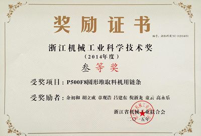 4月23日,浙江省機械工業(yè)聯(lián)合會四屆二次理事(擴大)會議暨2014年度科學(xué)技術(shù)獎頒獎大會在杭州召開。會上,浙江機械工業(yè)聯(lián)合會表彰了52項“2014年度浙江機械工業(yè)科學(xué)技術(shù)獎”獎勵項目。由東華集團技術(shù)中心組織申報、集團所屬杭州自強鏈傳動有限公司工程鏈?zhǔn)聵I(yè)部為主研發(fā)的“P500F8圓形堆取料機用鏈條”高端產(chǎn)品項目榮獲三等獎,這是東華集團的產(chǎn)品創(chuàng)新項目連續(xù)三年榮獲浙江省機械工業(yè)科學(xué)技術(shù)獎,也是2014年度全省諸多機械產(chǎn)品中唯一一項鏈傳動產(chǎn)品開發(fā)項目獲獎。