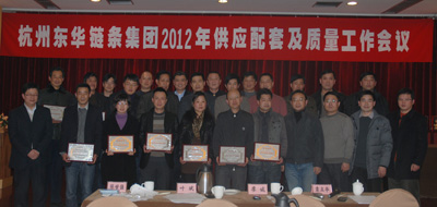 會(huì)議由副總經(jīng)理張寶康主持,張副總就2011年主要經(jīng)濟(jì)指標(biāo)完成情況和2012年經(jīng)濟(jì)目標(biāo)進(jìn)行了簡(jiǎn)要講話;總工程師葉斌就東華新品種開發(fā)取得的成果及發(fā)展目標(biāo)、技術(shù)工作方面作了講話;副總經(jīng)理袁立華就東華2011年完成的經(jīng)濟(jì)指標(biāo),供貨質(zhì)量情況及存在的差距、外協(xié)件的質(zhì)量及體系管理方面進(jìn)行了講話,并公布了2012年主要工作計(jì)劃;副總經(jīng)理廖杭州就2011年輸送鏈?zhǔn)聵I(yè)部的生產(chǎn)經(jīng)營情況進(jìn)行了回顧,同時(shí)代表各事業(yè)部就2012年事業(yè)部對(duì)采購和供應(yīng)商的主要要求即采購目標(biāo)和供應(yīng)鏈建設(shè)提出要求;財(cái)務(wù)總監(jiān)趙鵬飛宣布2011年優(yōu)秀供應(yīng)商名單,公司高層向優(yōu)秀供應(yīng)商代表頒發(fā)證書并合影。