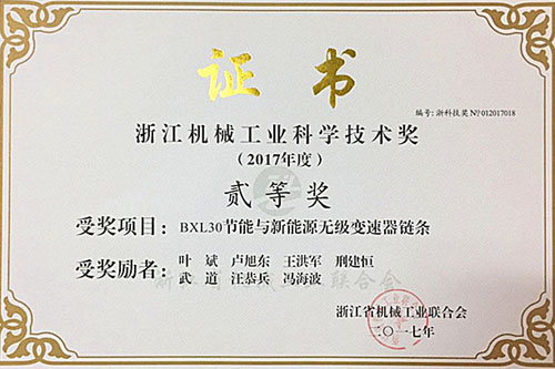 又訊:日前,公司生產(chǎn)的BXL30節(jié)能與新能源無級變速器鏈條被浙江省機械工業(yè)聯(lián)合會評為“浙江機械工業(yè)科學技術(shù)獎貳等獎”。