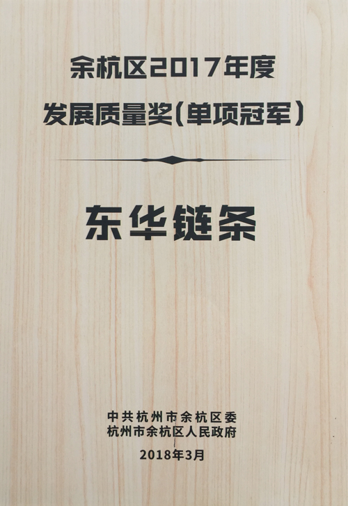 東華鏈條被授予“余杭區(qū)2017年度發(fā)展質(zhì)量獎(單項(xiàng)冠軍)”稱號