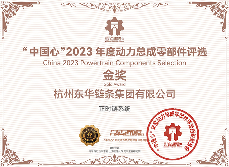 10月27日,“中國心”2023年度動力總成零部件評選在揚州市拉開帷幕。東華鏈條集團汽車鏈事業部總經理邢建恒、營銷處處長汪恭兵攜東華最新汽車正時鏈系統解決方案的CL04DF24-2x3W(132L)正時鏈系統、CL05DF2(a)4-2x4W(130L)正時鏈系統、CL04DF26-4x4W(174L)正時鏈正時系統參評,這三套正時系統產品已大批量配套國內主流汽車發動機。經過專家組現場評審,2023年度動力總成零部件共評出六名金獎和四名優秀獎。東華參選的“正時鏈系統”獲得“中國心”2023年度動力總成零部件金獎。獲獎理由為東華鏈條具備完全自主正向系統設計、仿真分析以及系統動態測試能力,其研發的輕量化、低摩擦、高耐磨、高疲勞鏈系統產品在國內汽車主機市場占有率達到22%。創新的銷軸表面滲釩專利技術廣泛應用于最新混動專用發動機、渦輪增壓發動機、柴油發動機和甲醛發動機。