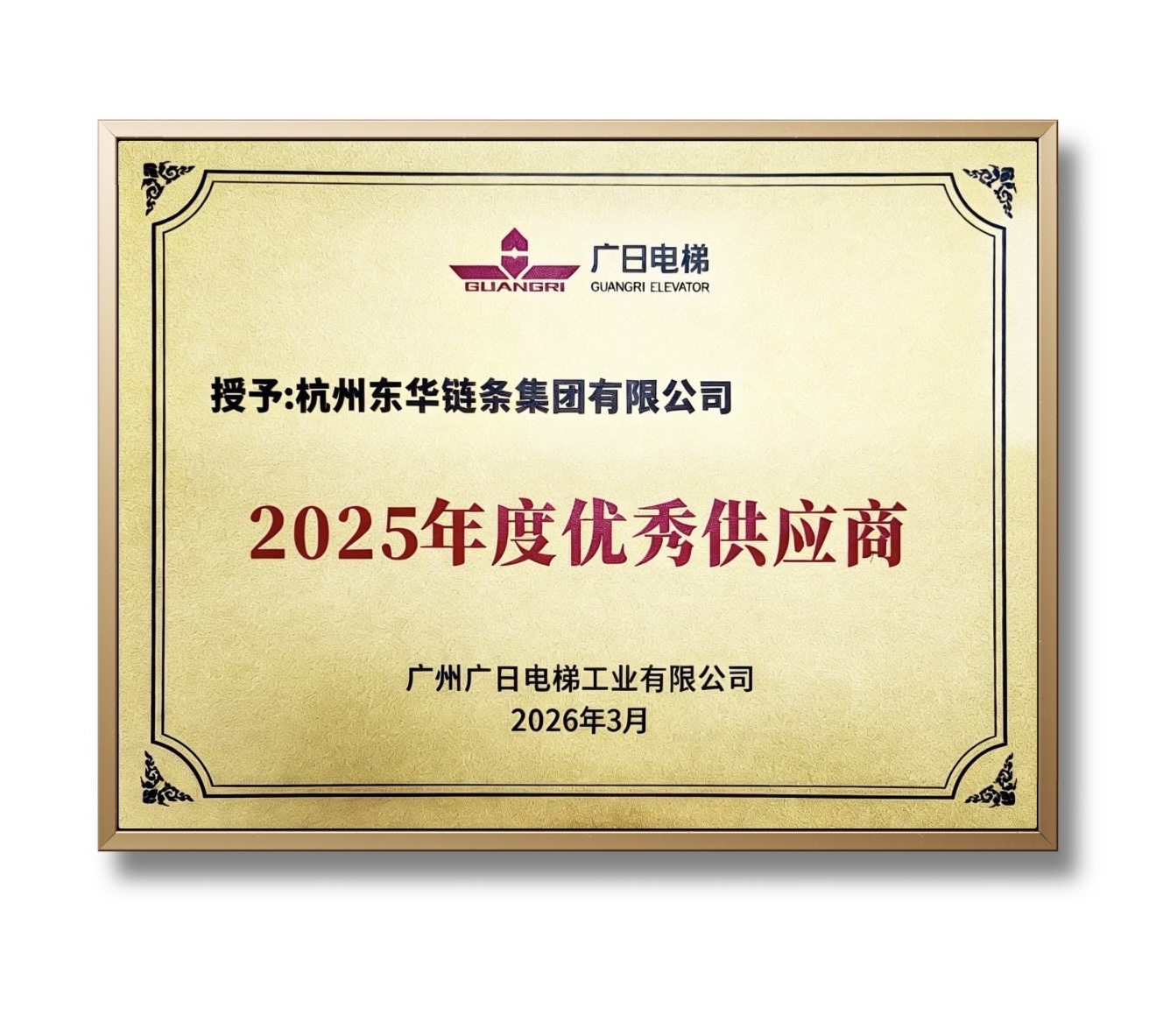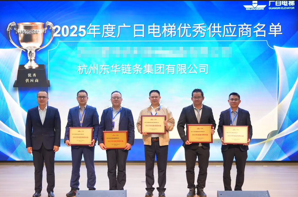 3月10日,東華鏈條受邀參加廣日電梯2025年度供應商大會,憑借卓越的產品質量、穩定的交付能力以及優質的配套服務,再次榮獲廣日電梯頒發的“2025年度優秀供應商”稱號,扶梯工程鏈事業部總經理汪希代表公司上臺領獎。這是東華連續第二年獲此殊榮,充分體現了廣日電梯對東華鏈條長期合作的高度認可。