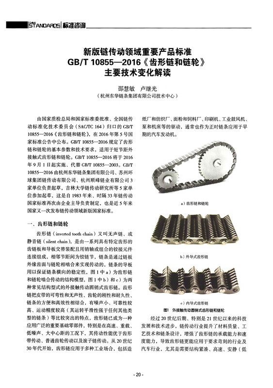 由杭州東華鏈條集團(tuán)有限公司主持修訂的GB/T 10855—2016《齒形鏈和鏈輪》新版國(guó)家標(biāo)準(zhǔn),自2016年9月1日起實(shí)施;這是中國(guó)鏈傳動(dòng)領(lǐng)域近期新發(fā)布的一項(xiàng)重要標(biāo)準(zhǔn)。為更好地宣貫好這項(xiàng)新標(biāo)準(zhǔn),應(yīng)《中國(guó)標(biāo)準(zhǔn)導(dǎo)報(bào)》雜志社的約稿要求,東華集團(tuán)技術(shù)中心技術(shù)標(biāo)準(zhǔn)化人員撰寫了《新版鏈傳動(dòng)領(lǐng)域重要產(chǎn)品標(biāo)準(zhǔn)GB/T 10855—2016〈齒形鏈和鏈輪〉主要技術(shù)變化解讀》這篇標(biāo)準(zhǔn)解讀論文,已刊登在《中國(guó)標(biāo)準(zhǔn)導(dǎo)報(bào)》2016年第4期上。下面將這篇論文轉(zhuǎn)載如下: